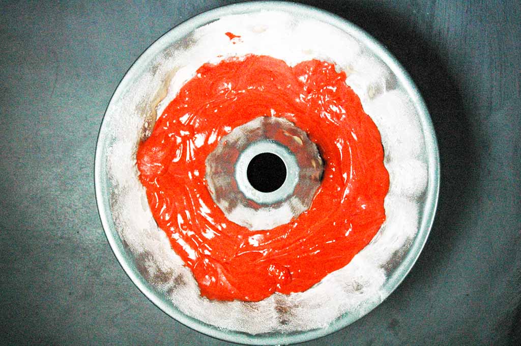 Pour all of the red cake batter into the bottom of the pan.