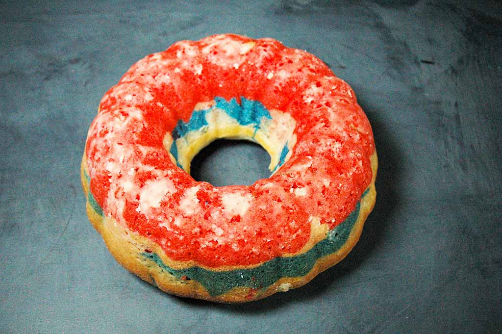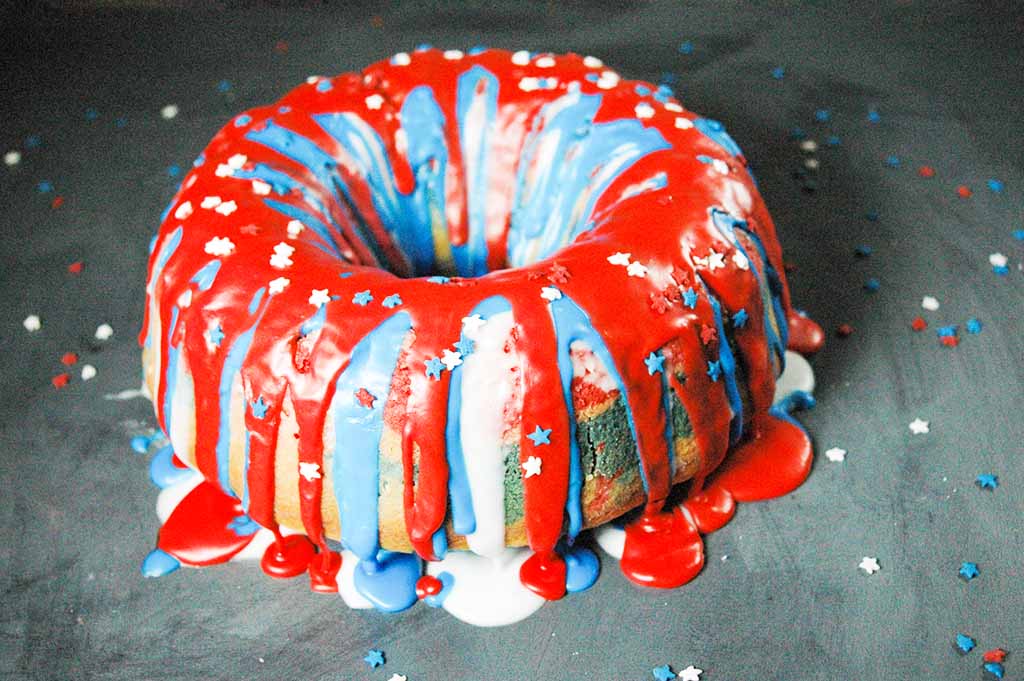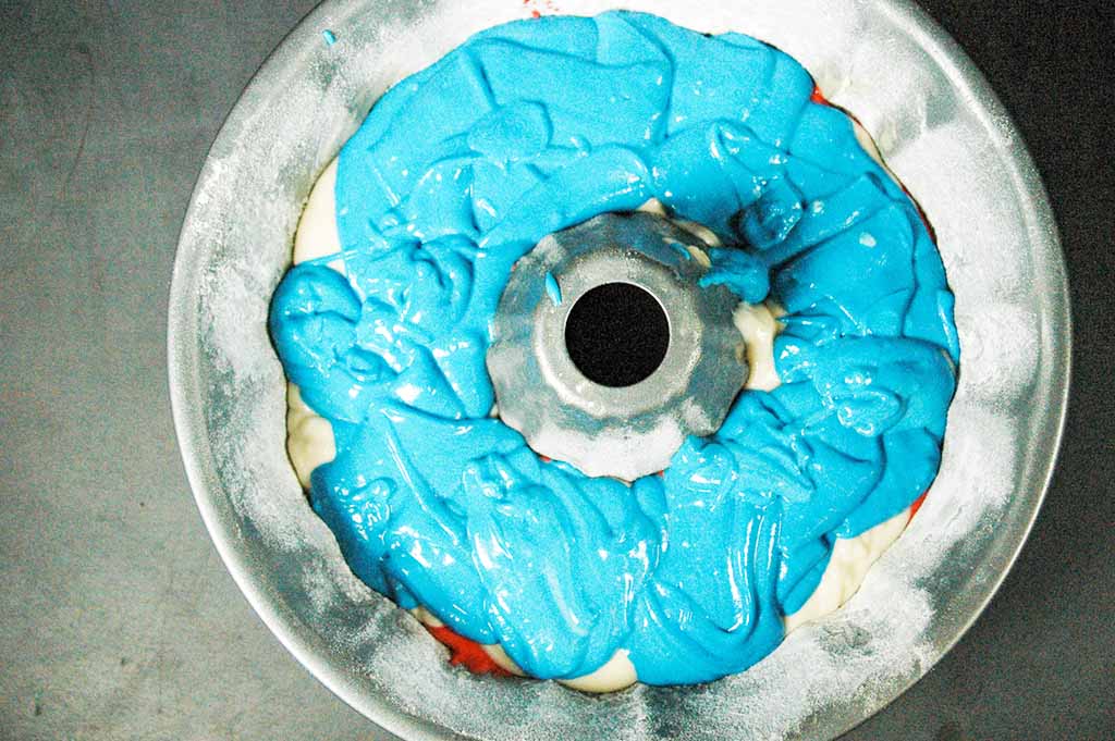 Pour all of the red batter into the bottom of the pan. Then, pour the white batter on top of the red, and finish with the blue. Don’t bother trying to get even layers. It’s actually best not to spread it around much so that the colors can flow into each other.